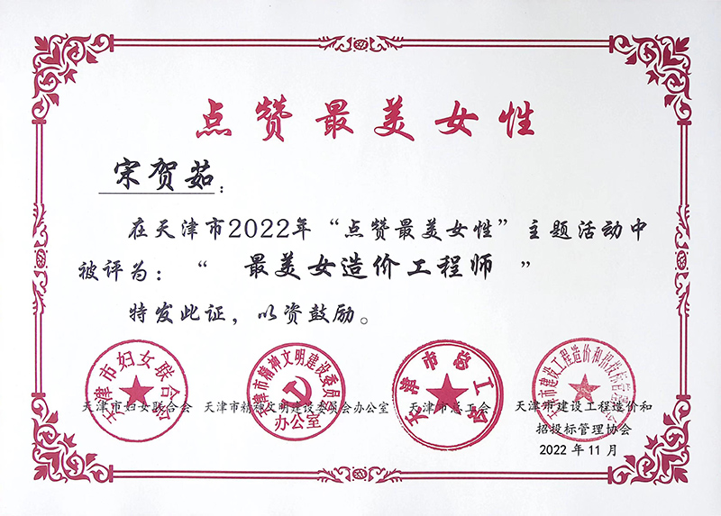 在“三八”國(guó)際勞動(dòng)?jì)D女節(jié)到來之際,從天津市泛亞工程咨詢有限公司傳來喜訊:在市婦聯(lián)、市文明辦、市總工會(huì)、津價(jià)招協(xié)聯(lián)合開展的天津市2022年“點(diǎn)贊最美女性”主題活動(dòng)中,泛亞公司造價(jià)三部部門經(jīng)理宋賀茹榮獲“最美女造價(jià)工程師”稱號(hào)。
