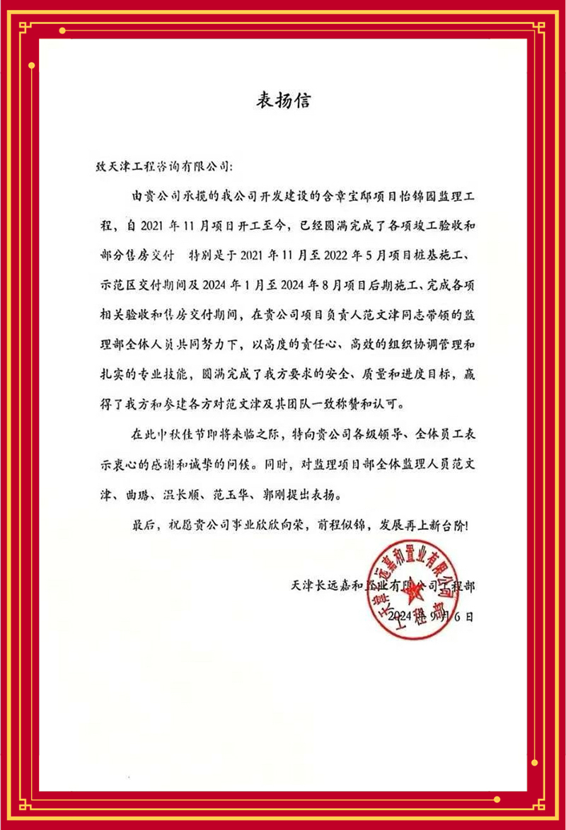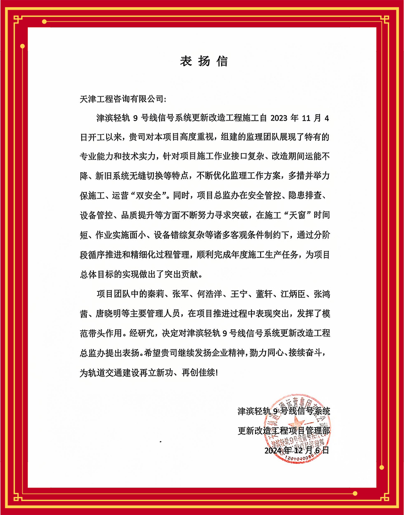 津?yàn)I輕軌9號(hào)線信號(hào)系統(tǒng)更新改造工程項(xiàng)目部感謝監(jiān)理團(tuán)隊(duì)多舉措解決項(xiàng)目施工作業(yè)接口復(fù)雜、改造期間運(yùn)能不降、新舊系統(tǒng)無縫切換等難題,力保施工、運(yùn)營“雙安全”;天津長遠(yuǎn)嘉和置業(yè)有限公司贊賞含璋寶坻項(xiàng)目怡錦園項(xiàng)目監(jiān)理團(tuán)隊(duì)以高度的責(zé)任心、高效的組織協(xié)調(diào)管理和扎實(shí)的專業(yè)技能推動(dòng)項(xiàng)目圓滿完成;天津華勘穂金房地產(chǎn)開發(fā)有限公司感謝監(jiān)理項(xiàng)目部主動(dòng)對接業(yè)主需求,有效管控質(zhì)量安全,切實(shí)保障施工進(jìn)度,很好地履行監(jiān)理職責(zé)......