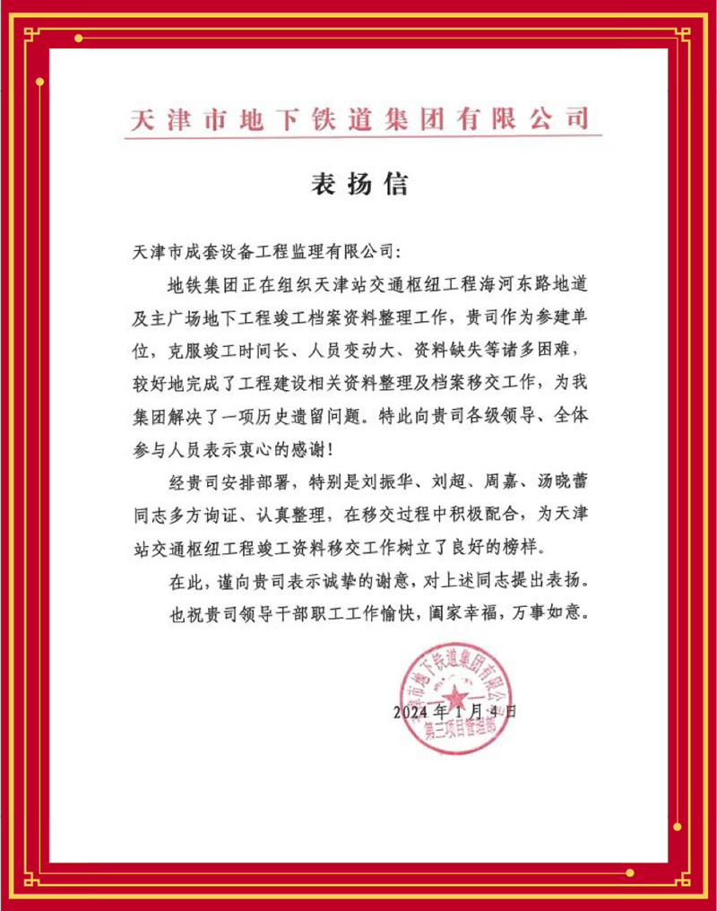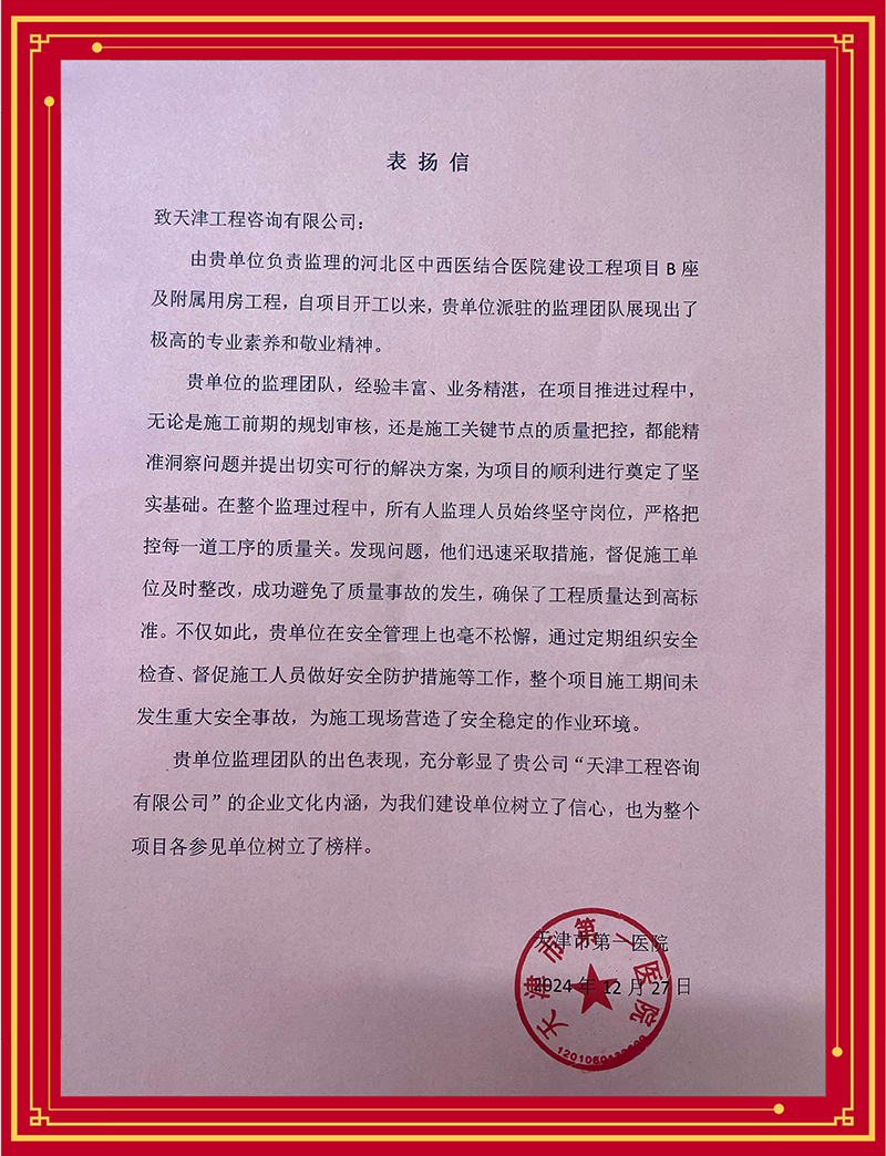 2024年,為持續(xù)深化“1264”戰(zhàn)略體系特別是“六化”舉措,加快推進(jìn)實(shí)體化進(jìn)程,天津咨詢順利完成吸收合并下屬成套監(jiān)理公司,在持續(xù)打造天津咨詢品牌,以工程監(jiān)理和項(xiàng)目管理為基礎(chǔ),發(fā)揮在項(xiàng)目建設(shè)期的綜合專業(yè)優(yōu)勢,逐步形成“監(jiān)”“管”一體化服務(wù)模式方面邁出關(guān)鍵一步。近期,多家業(yè)主單位先后發(fā)來感謝信、表揚(yáng)信,對天津咨詢承擔(dān)工程建設(shè)監(jiān)理任務(wù)給予充分肯定。