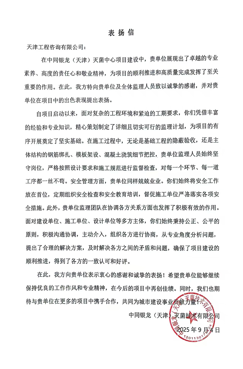天津華勘穗金房地產(chǎn)公司、中同銀龍(天津)公司也先后發(fā)來(lái)表?yè)P(yáng)信,對(duì)天津咨詢河?xùn)|金貿(mào)產(chǎn)業(yè)園區(qū)11-D、15號(hào)項(xiàng)目團(tuán)隊(duì)和中同銀龍(天津)滅菌中心建設(shè)項(xiàng)目的監(jiān)理工作予以表?yè)P(yáng)感謝,認(rèn)為我司項(xiàng)目監(jiān)理部積極主動(dòng)對(duì)接業(yè)主需求,溝通協(xié)調(diào)參建各方,過(guò)程中加強(qiáng)技術(shù)管理支撐和質(zhì)量安全風(fēng)險(xiǎn)防控,用“事事落地、件件閉環(huán)”的擔(dān)當(dāng),筑牢項(xiàng)目落地的責(zé)任防線,用實(shí)際行動(dòng)詮釋了優(yōu)質(zhì)監(jiān)理服務(wù)的內(nèi)涵。