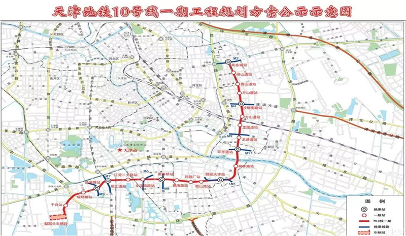 天津地鐵10號(hào)線(xiàn)為城區(qū)西南至東北方向的軌道交通骨干線(xiàn),南起西青區(qū)梨園頭,最終進(jìn)入北部新城地區(qū),全長(zhǎng)43.2公里。地鐵10號(hào)線(xiàn)南段工程由梨園頭至嶼東城,從衛(wèi)國(guó)道途經(jīng)沙柳路、天鋼柳林、珠江道、麗江道、梅江至梨園頭車(chē)輛段,線(xiàn)路全長(zhǎng)約21公里,其中地下線(xiàn)20.3公里,過(guò)渡線(xiàn)及地面線(xiàn)0.7公里,共設(shè)21座車(chē)站(20個(gè)地下站,1個(gè)地面站),設(shè)梨園頭車(chē)輛段,與地鐵1、2、4、5、6號(hào)線(xiàn)換乘。