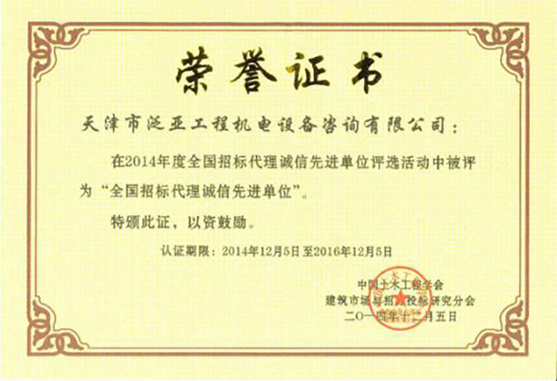 2014年度全國(guó)招標(biāo)代理誠(chéng)信先進(jìn)單位