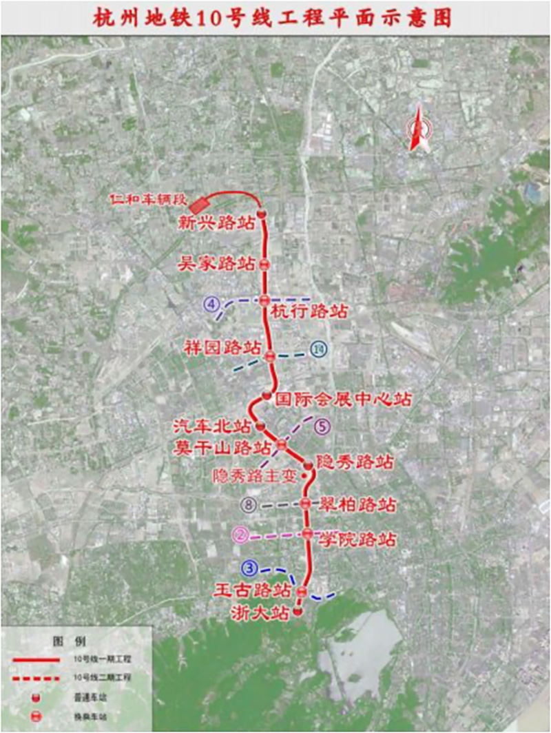 項(xiàng)目建設(shè)規(guī)模規(guī)模10號線一期工程起于浙大站,沿浙大路→玉古路→學(xué)院路→余杭塘河邊→莫干山路→石祥路→杭行路→勾仁大道敷設(shè),終止于新興路站,線路全長15.92公里,設(shè)置站點(diǎn)12座,全部為地下線,平均站間距1407.21米。10號線一期工程可與地鐵2、3、4、5、14等5條線路形成換乘。
